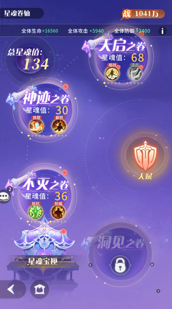 解锁卷轴:星魂卷轴分作天启、神迹、不灭、洞见四卷,需要达到对应等级和星魂值才能解锁,星魂值可以通过激活/升阶星魂羁绊获得。