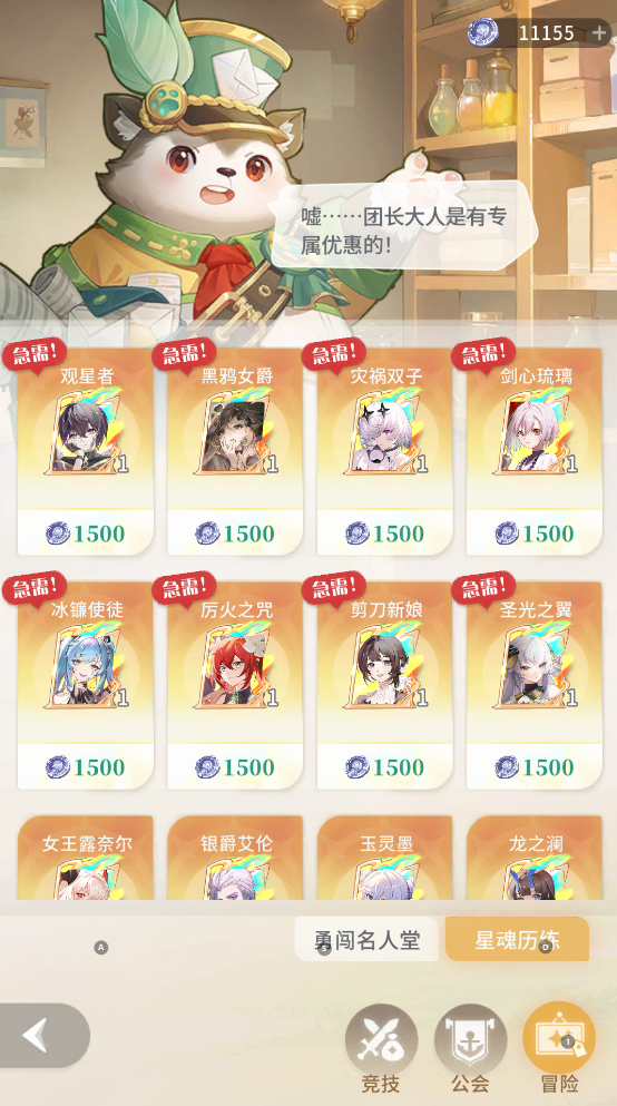 星魂的兑换商店:星魂币数量有限,推荐团长优先兑换传说星魂或者急缺的史诗星魂(比如距离完成羁绊差 1 枚星魂的情况),在集齐全部传说星魂羁绊激活额外加成后,再考虑兑换其他需要的星魂激活集齐剩余的羁绊,最后再根据情况依次兑换升星。
