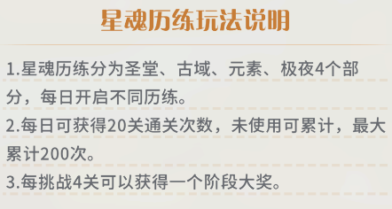 星魂历练:每日轮换不同的历练类型(圣堂、古域、元素、极夜),通过关卡可以获得星魂币、星魂钥匙等奖励。